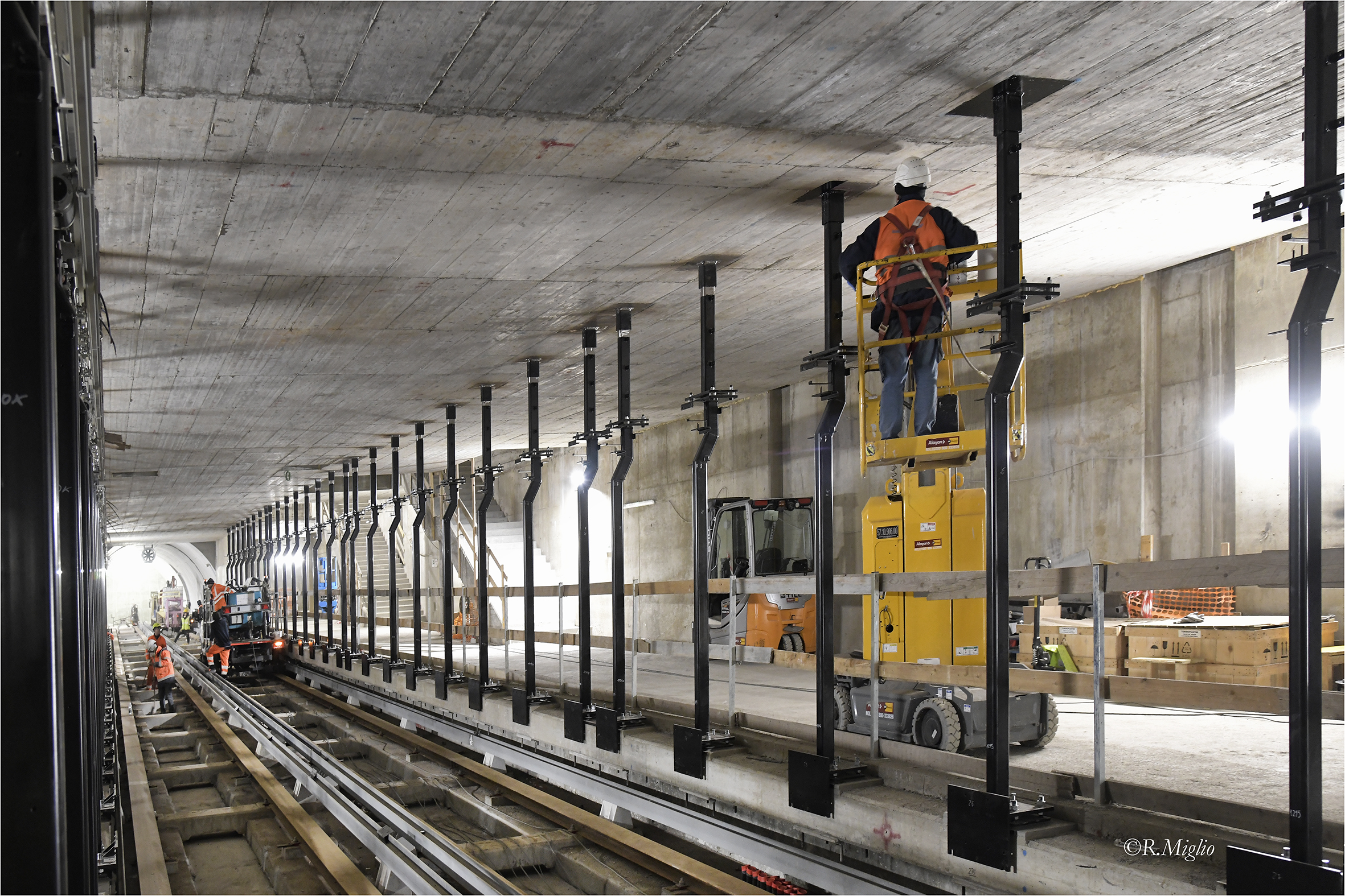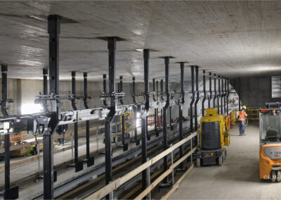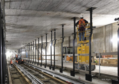 Terminata l’esecuzione del solaio livello atrio e delle scale di collegamento alla banchina. Terminati i getti delle fodere superiori e dei vani ventilazione. In corso la posa del ferro dell’asola di calaggio al piano atrio.